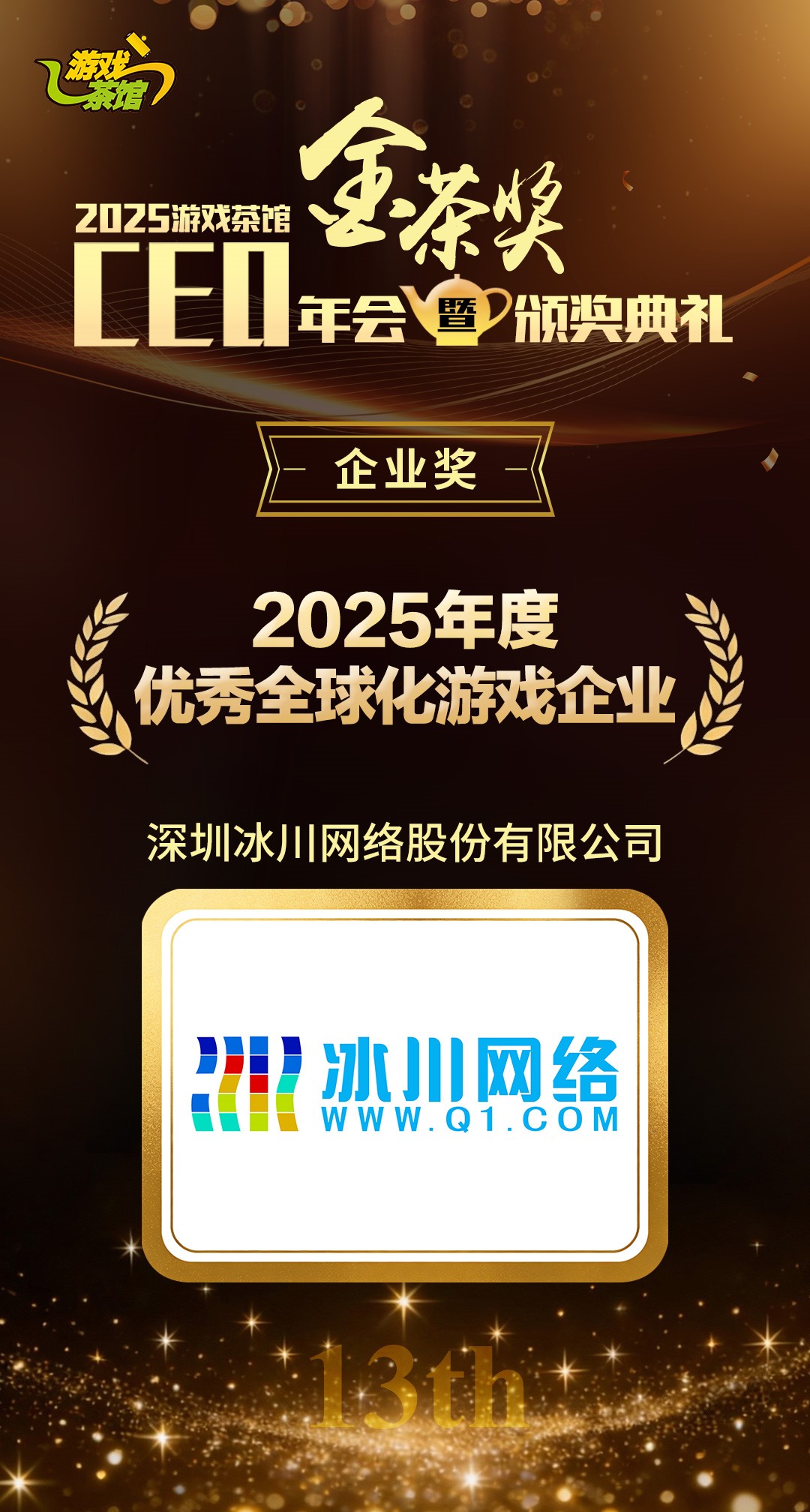 2026年1月22日,由游戏茶馆举办的第十三届金茶奖颁奖典礼在上海圆满落幕。冰川网络凭借在全球市场的卓越表现,荣获“2025年度优秀全球化游戏企业”奖项。