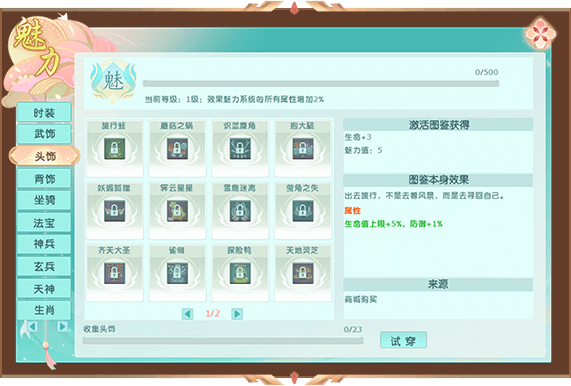 收集以下外观可获得魅力值:时装、武饰、背饰、坐骑、头饰、法宝、天神、神兵、玄兵,生肖。